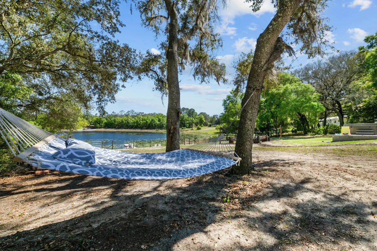 Lounge in the outdoor hammock nestled among the trees, offering a tranquil spot with relaxing views of the lake.”