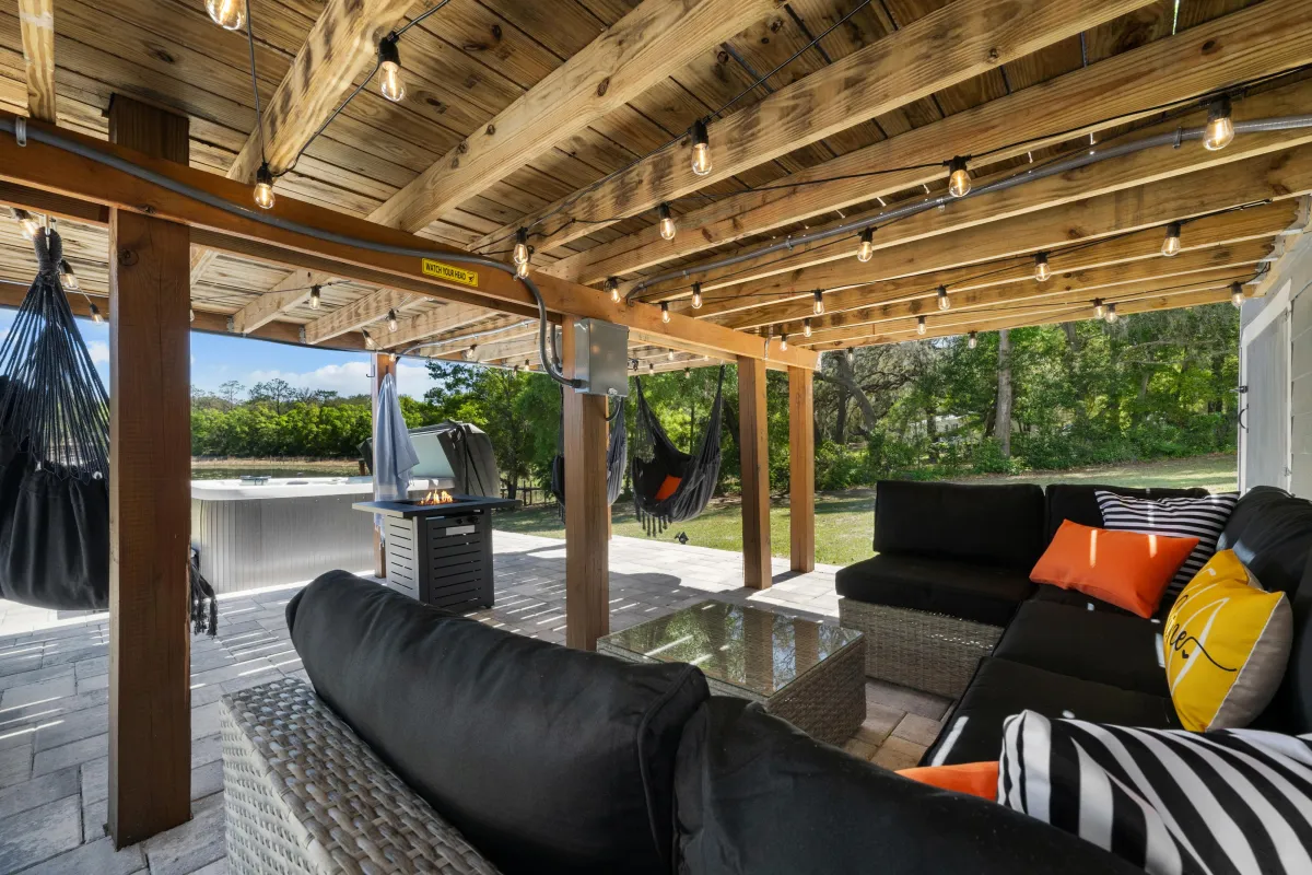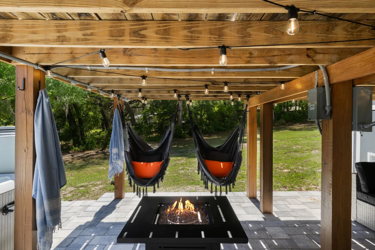 Lounge in the indoor hammock set beside the cozy fire pit, offering the perfect spot to relax in comfort and warmth.